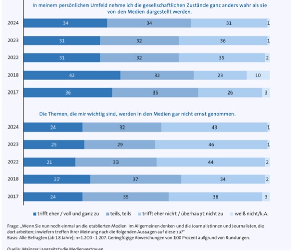 Fawzi, N., Ziegele, M., Schultz, T., Jackob, N., Jakobs, I., Viehmann, C., … Stegmann, D. (2025). Stabiles Medienvertrauen auch in Zeiten politischer Umbrüche: Mainzer Langzeitstudie Medienvertrauen 2024. Media Perspektiven, (13/2025), 1–20.