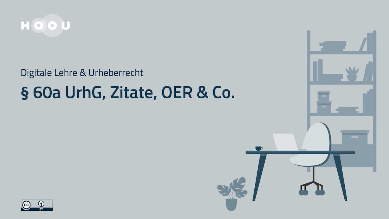 Das 11-minütige Video fasst in kompakter Form die urheberrechtlichen Grundlagen für die digitale Lehre zusammen: die gesetzliche Erlaubnis des § 60a UrhG zugunsten von Unterricht und Lehre und des § 51 UrhG zur Zitierbefugnis. Ebenfalls wird kurz auf die Einsatzmöglichkeiten von Open Educational Resources (OER) eingegangen.