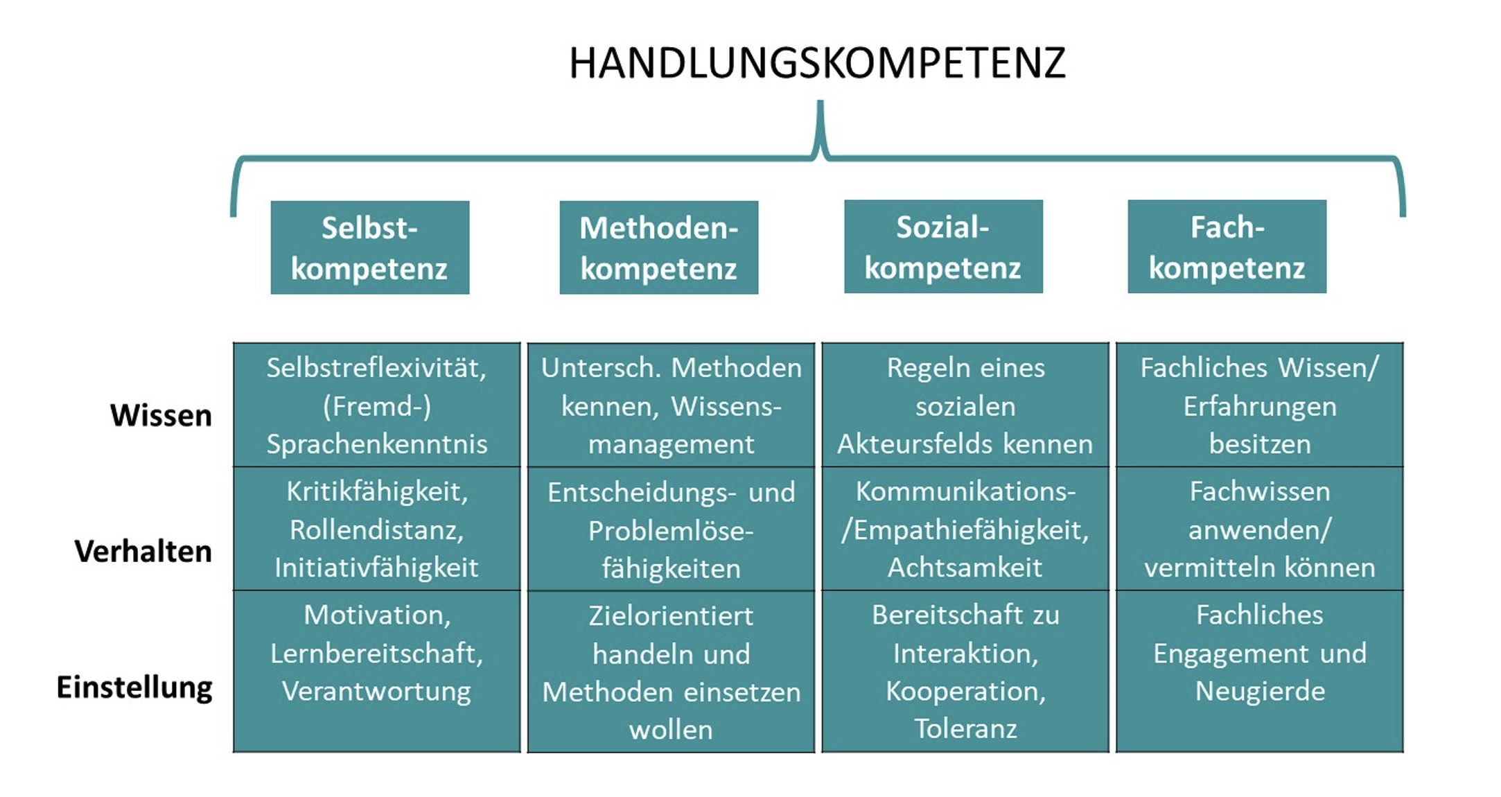 Der Begriff „Kompetenz“ ist eine Entlehnung aus dem lat. „competentia“ für Zusammentreffen, Symmetrie, Analogie wie auch Zugehörigkeit und Zuständigkeit. Die Verwendung des Substan-tivs im Lateinischen und im Deutschen folgen denen des Verbs lat. „competere“, zusammen-treffen, zusammenbringen (Pfeifer, 1993). Es geht bei „Kompetenz“ demnach darum, etwas zusammenzubringen. Im Wesentlichen werden dort drei Bereiche beschrieben, die zusam-mengebracht werden, wenn es um kompetentes Handeln geht. Diese drei Bereiche setzen sich aus Wissen (kognitive Ebene), Einstellung (affektive Ebene) und den Fähigkei-ten/Fertigkeiten/Verhalten (konative Ebene) zusammen. Alle drei Bereiche werden immer in Bezug auf vier Teilkompetenzen zusammengebracht: Sozialkompetenz, Selbst-/Persönlichkeitskompetenz, Fach-/Sachkompetenz, Methodenkompetenz.