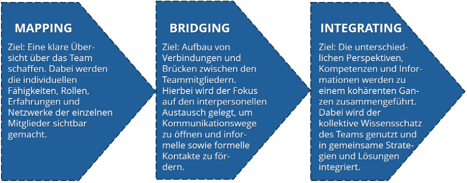 • Mapping - Verstehen der Unterschiede: Die erste Komponente des MBI-Modells ist die Beschreibung und das Verständnis der Unterschiede relevanter sozialer Praktiken zwischen den Teammitgliedern und der Einfluss dessen auf die erforderlichen Aspekte zur erfolgreichen Zielerreichung. Das Mapping beinhaltet also das Erkennen, Beschreiben und Verstehen der Unterschiede und Gemeinsamkeiten zwischen den Teammitgliedern und die Auswirkungen, die diese Unterschiede auf die Teamarbeit haben könnten. In dieser Phase erfahren die Teammitglieder, wer welche Kompetenzen besitzt, welche Erfahrungen der Teamarbeit vorhanden sind und wie die Expertise im Team verteilt ist. Das erleichtert die gezielte Ansprache bei spezifischen Fragestellungen und fördert das Verständnis für die Teamdynamik.
