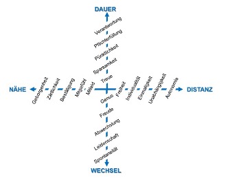 Die Abbildung zeigt ein Achsenkreuz mit den vier Persönlichkeitsausprägungen Dauer, Wechsel, Distanz und Nähe. Dabei sind Dauer und Wechsel sowie Distanz und Nähe als Gegenpole der zwei Achsen aufgetragen. Zusätzlich sind auf den Achsen einige für jede Prägung typische, positive Wertvorstellungen eingetragen. Daraus wird deutlich, dass diese Grundausrichtungen keine Bewertung darstellen.