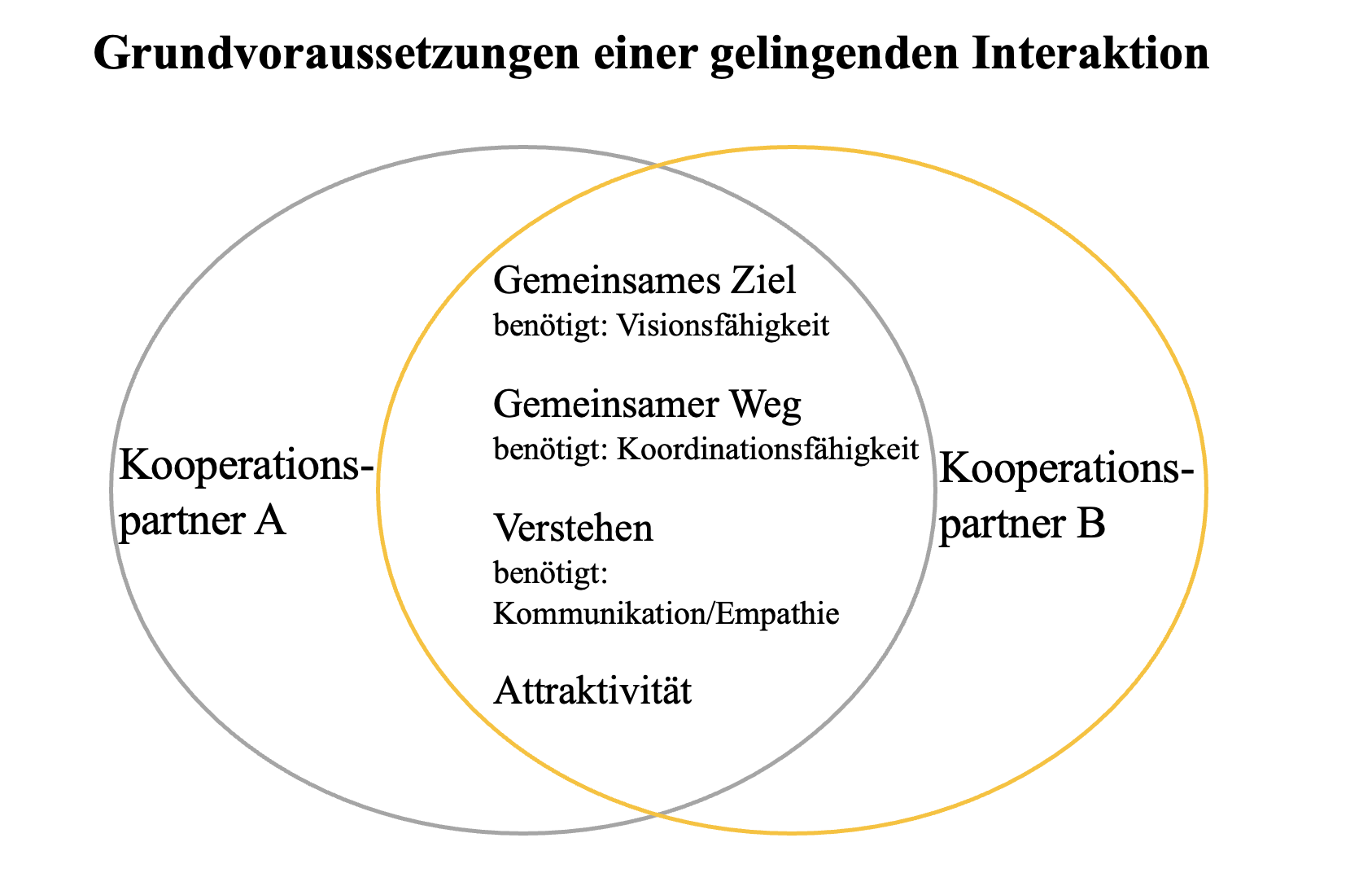 Zur weiteren Verdeutlichung soll auf das Modell Gelingender Interaktion von Martin/Dress hingewiesen werden. Hiernach ist es notwendig, dass die Kooperation für beide Partner*innen attraktiv ist. Das jeweilige kooperative Unternehmen sollte dem jeweils anderem, das bieten, was dieses sich für die Kooperation wünscht. Damit ist die motivationale Grundlage gegeben. Einerseits sollte man dafür sorgen, für den anderen attraktiv zu sein. Gleichzeitig sollte das Gegenüber ebenfalls attraktiv sein. Attraktivität zeigt sich in der Antwort auf die Frage, was es einem bringt, mit dem anderen zu kooperieren (Martin / Drees 1999, S. 78).