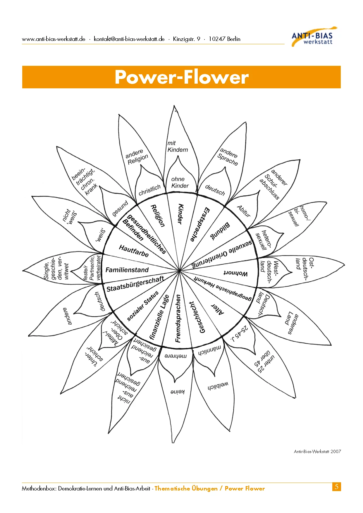 Lutz und Wenning (2001) sprechen von bipolaren hierarchischen Differenzlinien, die pro sozialer Kategorie einen Grunddualismus in sich tragen: z. B. Kategorie Geschlecht (Frau/Mann); Hautfarbe (weiß/nicht weiß). Auch wenn es sich dabei um sozial konstruierte Kategorien handelt, sind diese sozial wirksam. Versuchen Sie nun alle Blütenblätter mit der entsprechenden privilegierten und benachteiligten Position zu beschriften.