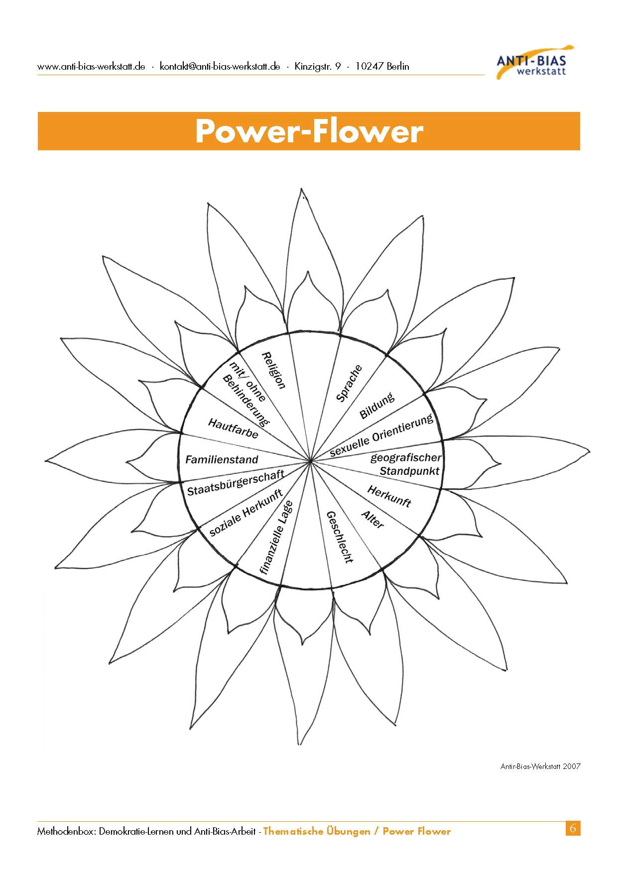 Schauen Sie sich die erste Version des Arbeitsblatts „Power Flower“ an. In der Mitte der Blüte stehen soziale Differenzkategorien. Auf dem inneren Blütenblatt soll die jeweilige privilegierte Position vermerkt sein: z. B. bei der Kategorie Behinderung „ohne Behinderung“. Auf dem äußeren Blütenblatt steht die benachteiligte Position: z.B. „mit Behinderung“.